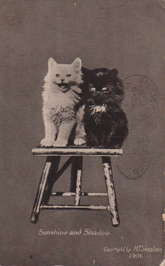 Sunshine & ShadowThe year was 1907. The M.T.Sheahan postcard company was located in Boston, Massachusettes. "Sheahan's Good Mottos make the world brighter", as it says on the card.